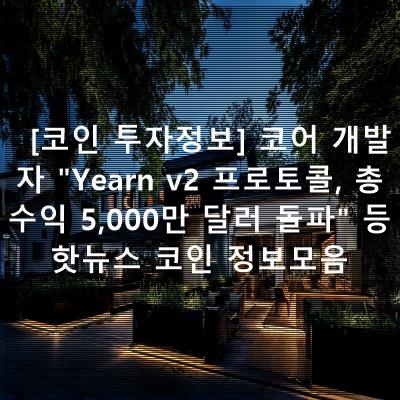 [์ฝ์ธ ํฌ์์ ๋ณด] ์ฝ์ด ๊ฐ๋ฐ์ "Yearn v2 ํ๋กํ ์ฝ, ์ด์์ต 5,000๋ง ๋ฌ๋ฌ ๋ํ" ๋ฑ ํซ๋ด์ค ์ฝ์ธ ์ ๋ณด๋ชจ์๋ฐ ์ต์ ์์ ์ ๋ฆฌ๋๋ฆฝ๋๋ค.